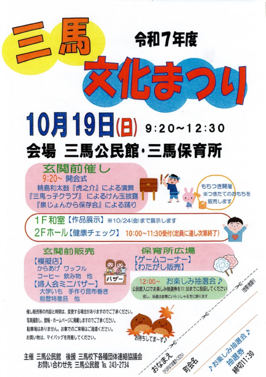 ちなみに三馬公民館さんの文化祭は10月19日(日)になります。9:20~12:30の開催時間になります。三馬公民館さんの文化祭チラシをリンクしておきます。